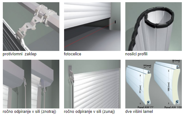 Vrata so narejena iz vrhunskih aluminijastih profilov, spodnji del vrat je zaščiten z votlim gumijastim tesnilom, ki jih dodatno ščiti pred vremenskimi vplivi in obrabo. Kvalitetna rolo vrata preprečujejo uhajanje toplote in zmanjšujejo toplotne izgube v vašem domu.
