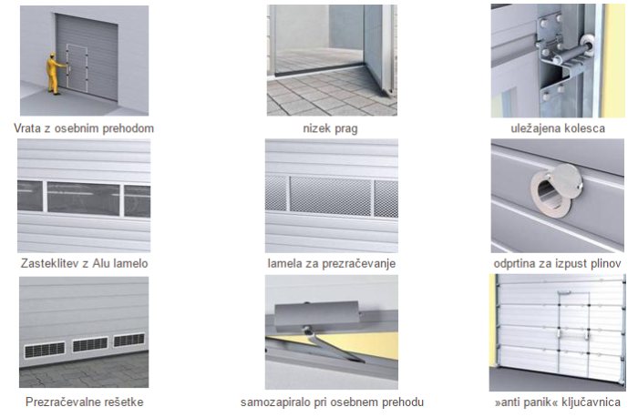 Vrata za osebni prehod so lahko vgrajena v vratno krilo. Varnostno stikalo preprečuje avtomatski dvig vrat, kadar so vrata za osebni prehod odprta. Lahko so opremljena tudi s samozapiralom.