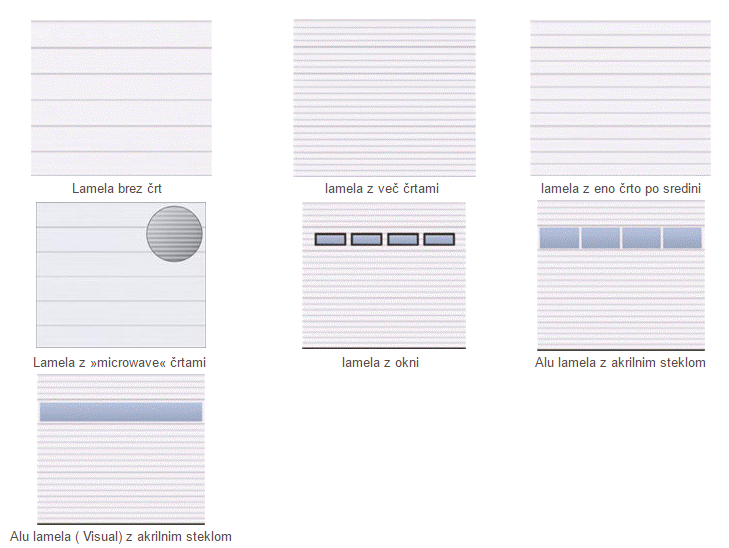 Vsi deli sekcijskih vrat so narejeni iz pocinkane pločevine ( vodila, pritrdilni material ) ali iz pocinkane pločevine, ki je lakirana s poliestrsko barvo ( lamele ). Lamele za vratno krilo so debele 40 mm. Kakovostni materiali in izdelava jamčijo dolgo uporabo. Lamele so na voljo v več izvedbah: jeklene polne, Alu z akrilnim steklom, Alu z akrilnim steklom – VISUAL izvedba. Lamela je izdelana tako, da je na mestu, kjer so pritrjeni tečaji, večslojna. To omogoča fiksno pritrditev tečajev.